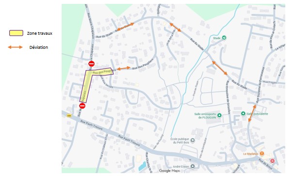 À partir du 4 mars 2026 et pour une durée de 5 semaines, le Service eau et assainissement de la communauté de communes du Pays des Abers entreprend des travaux de renouvellement sur le réseau d’Assainissement (tout à l’égout) de Plouguin, dans la rue Marie Chapalain et la rue des Peupliers (voir plan ci-dessous).