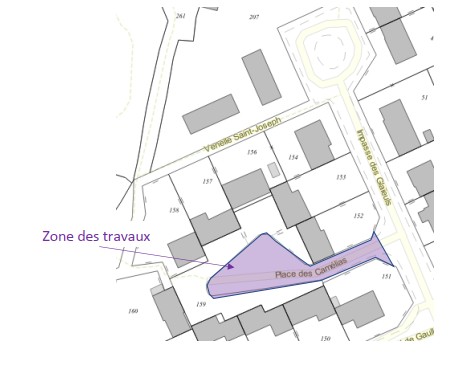 L’accès à la place sera difficile durant les heures de travail, soit 8h00-17h30. (Voir ci-dessous le plan de la zone impactée)Toutefois, l’entreprise Bouygues Energies Services, réalisant les travaux, conservera un accès au droit de vos propriétés afin de vous permettre d’y accéder. Cependant, nous demandons, autant que possible, de limiter vos déplacements pendant les heures de travail et, si possible, de déplacer vos véhicules place des Glaïeuls. De plus, notre prestataire devra intervenir en partie dans votre propriété afin de raccorder votre branchement au futur réseau, car à ce jour les conduites qui étaient en domaine public se retrouvent en partie privée. (Voir plan ci-joint). En dehors des horaires de travail de l’entreprise (nuit et week-end), le chantier sera clos avec mise en place de barrières de protection.